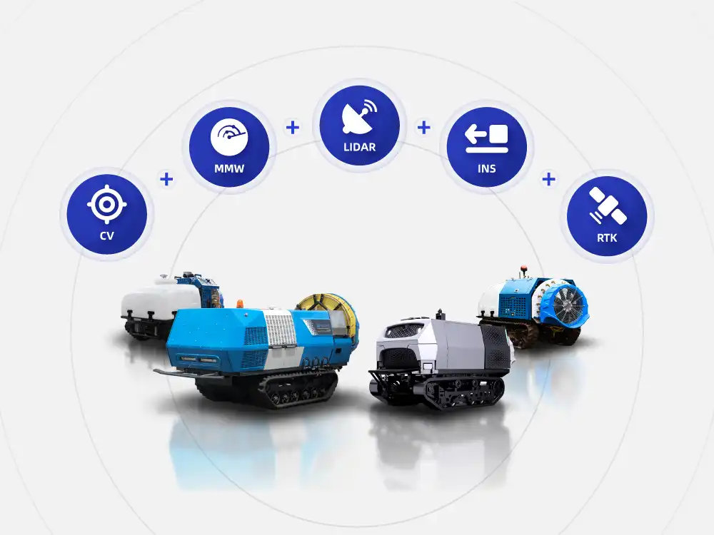 Designed for orchard challenges, the solutions combine AI with 5D fusion navigation (LiDAR, vision, millimeter-wave radar, and RTK). This enables 24/7 unmanned operations. Unlike traditional RTK navigation needing manual mapping, the new robots use four-point positioning to plan paths autonomously. They adapt to complex terrains, dense canopies, and low-signal areas, boosting accuracy and efficiency.